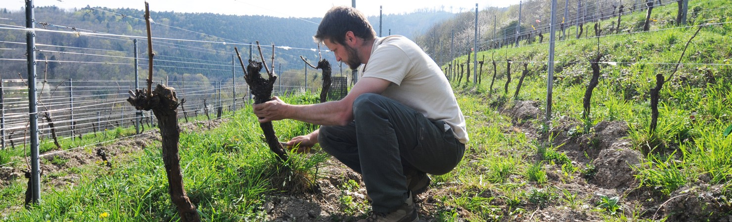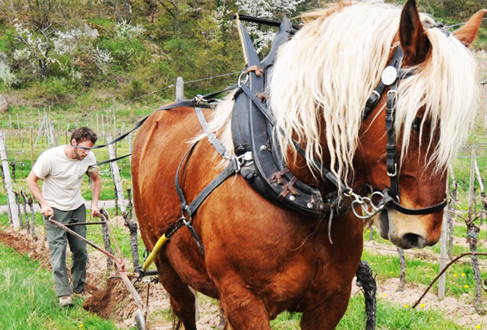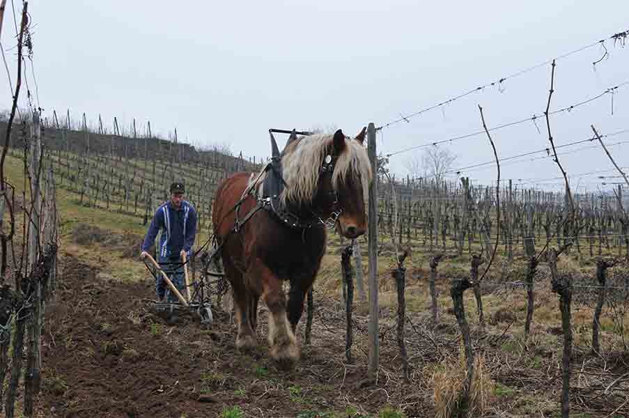 Bei der Arbeit im Weinberg wird Antoine Kreydenweiss von seinem treuen Vierbeiner unterstützt. Dieser eine PS (im wahrsten Sinne des Wortes Pferdestärke) sorgt dafür, dass der Boden nicht verdichtet wird, wie es bei anderen landwirtschaftlichen Geräten der Fall ist.